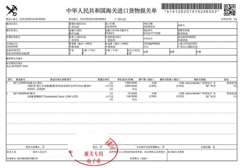 广州机场报关所需单证;装箱单,发票,合同,3C证明