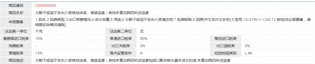 商品描述: 分散于或溶于非水介质其他油漆、清漆溶液;其他本章注释四所述溶液
