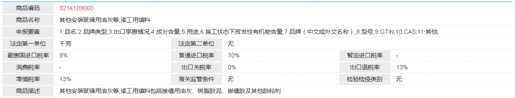 申报要素:1:品名;2:品牌类型;3:出口享惠情况;4:成分含量;5:用途;6:施工状态下挥发性有机物含量;7:品牌(中文或外文名称);8:型号;9:GTIN;10:CAS;11:其他;