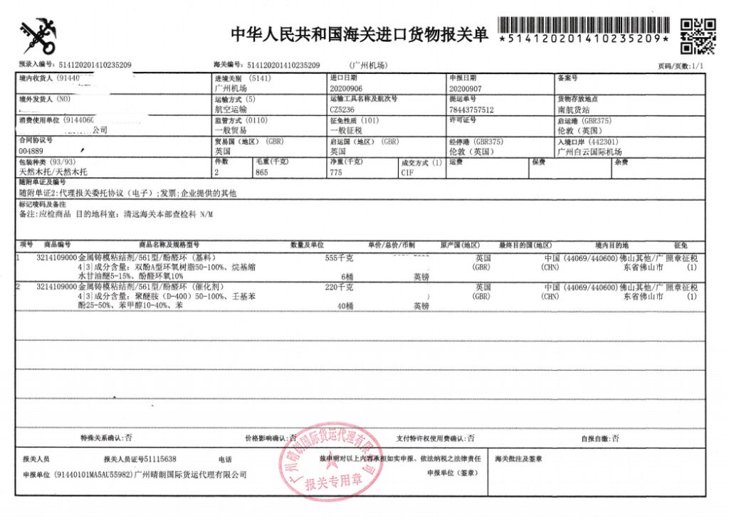 广州机场进口报关所需单证;装箱单,发票,合同,提单,MSDS等